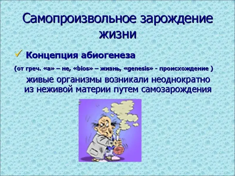 - Теория самопроизвольного зарождения Сторонники данной теории утверждали, что живые организмы возникали неоднократно из неживой материи путем самозарождения. - концепция абиогенеза (от греч. "а" - не, "bios" - жизнь, "genesis" - происхождение). (Слайд №4) Древнегреческие философы принимали идею возникновения живых существ из воды либо из различных влажных или гниющих материалов. Но еще Фалес (624-547 гг. до н.э.) оспаривал мифологические представления и создал стихийно-материалистическое мировоззрение с элементами диалектики. Согласно Фалесу и его последователям, возникновение живых существ из воды произошло без какого-либо вмешательства духовных сил; жизнь есть свойство материи. Согласно Аристотелю (384-322 гг. до н. э.), определенные частицы вещества несут в себе "активное начало", способное в подходящих условиях создать живой организм. Это "начало" можно обнаружить в оплодотворенном яйце, гниющем мясе, тине и солнечном свете: