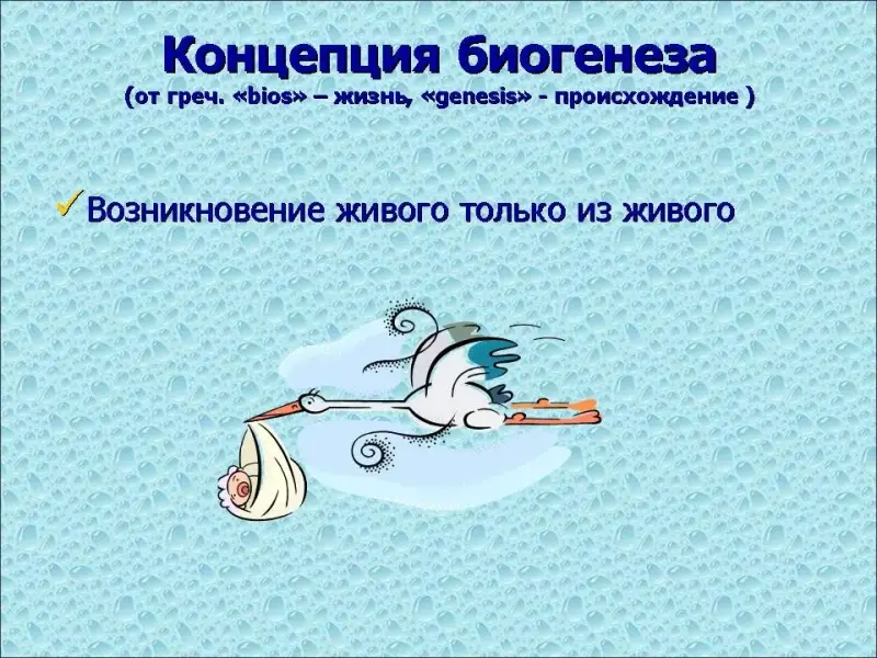 На рубеже XVI-XVIIв.в. Ван Гельмонт (1579 - 1644 г.г.) описал эксперимент, в котором ему удалось из грязного белья и пшеницы, помещенных в темный шкаф, получить мышей. Активным началом зарождения мыши Ван Гельмонт считал человеческий пот. (Слайд №5) - концепция биогенеза (от греч. "bios" - жизнь, "genesis" - происхождение). (Слайд № 6)