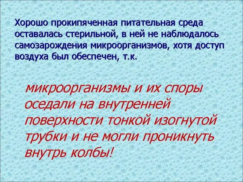 В 1668г. итальянский врач Франческо Реди (1626-1698 гг.) доказал, что белые черви, которые встречаются в мясе, являются личинками мух; если мясо или рыбу закрыть, пока они свежие, и предотвратить доступ мух, то они, хотя и сгниют, но не произведут червей. Из этого Ф. Реди сделал вывод о возникновении живого только из живого). (Слайд №7) В 1765 году Ладзардо Спалланцани (1729-1799 гг.) подвергнул мясные и овощные отвары кипячению и сразу же запечатал их. Через несколько дней он исследовал отвары и не обнаружил никаких признаков жизни. Из этого он заключил, что высокая температура уничтожила все живое, и ничего нового уже не могло возникнуть. (Слайд №8)