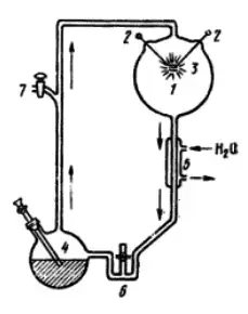 1 - реакционная колба; 2 - вольфрамовые электроды; 3 - искровой разряд; 4 - колба с кипящей водой; 5 - холодильник; 6 - ловушка; 7 - кран, через который в аппарат подается газовая смесь