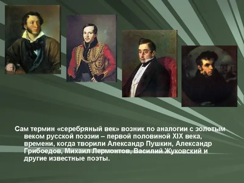 Сам термин "серебряный век" возник по аналогии с золотым веком русской поэзии - первой половиной XIX века, времени, когда творили Александр Сергеевич Пушкин, Александр Сергеевич Грибоедов, Михаил Юрьевич Лермонтов, Василий Андреевич Жуковский и другие известные и знаменитые поэты.