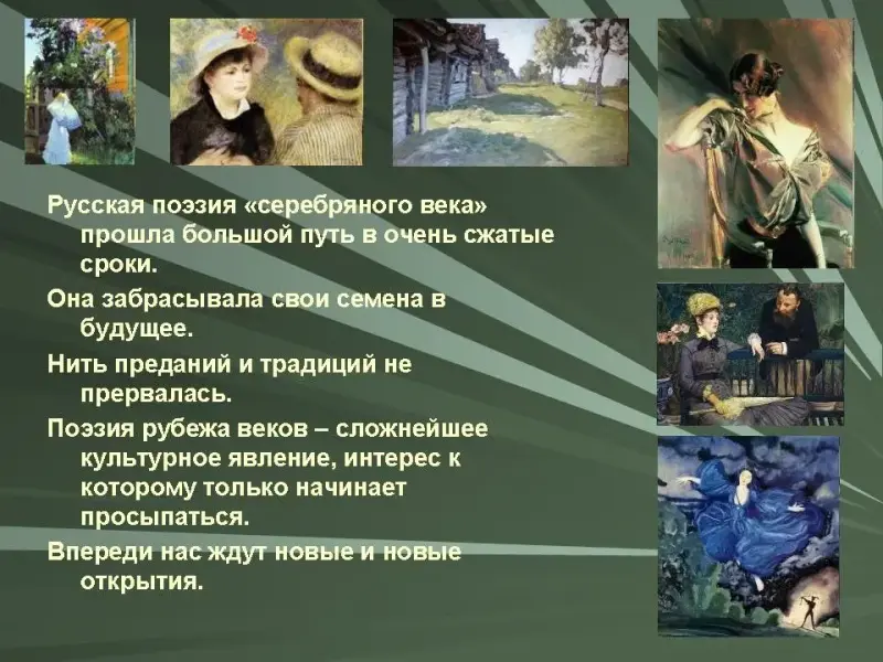 Русская поэзия "серебряного века" прошла большой путь в очень сжатые сроки. Она забрасывала свои семена в будущее. Нить преданий и традиций не прервалась. Поэзия рубежа веков - сложнейшее культурное явление, интерес к которому только начинает просыпаться. Впереди нас ждут новые и новые открытия.