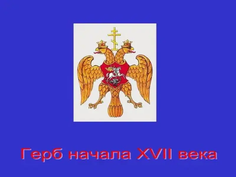 Герб в начале XVII века. В лапах орла появляются символы самодержавной власти - скипетр и держава. Грудь орла украшена щитом с иконным изображением Георгия Победоносца - защитника Отечества, борющегося со змием. В этом гербе отразилась постоянная борьба добра и зла.