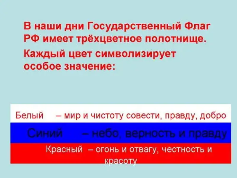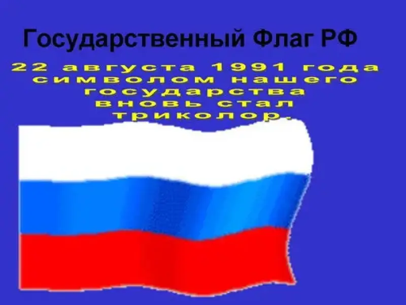 В древности флаг назывался стягом. Затем по-славянски его звали знаменем. Раньше в битвах знамена имели большое значение, поскольку указывали местонахождение военачальников и отдельных отрядов. Наш флаг имеет прямоугольную форму и состоит из трех горизонтальных полос. С августа 1991 года Верховный совет РСФСР постановил считать его национальным флагом России. Такой флаг появился в России при Петре I в XVII веке. Первоначально он был флагом торгового флота. Именно под ним путешествовало по Европе Великое посольство. В XIX в. (до октябрьской революции 1917 года) триколор становится национальным государственным флагом Российской Империи.