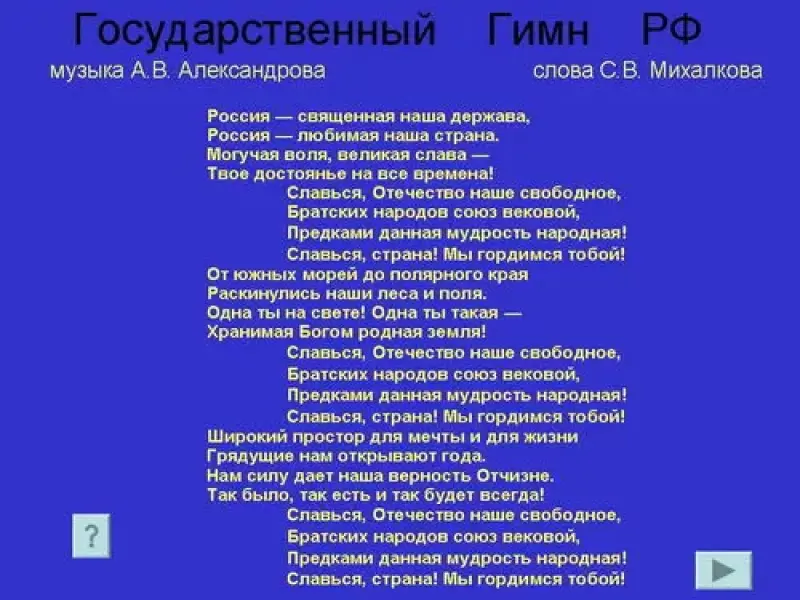 - "Гимн РФ" - слова С.Михалкова, музыка А.В.Александрова.