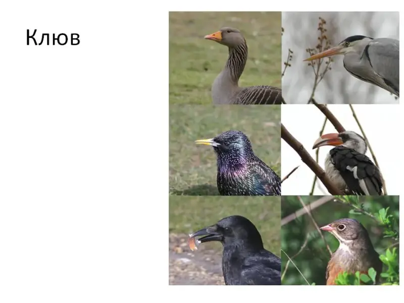 Птичий клюв на все руки мастер: щиплет, хватает, дробит, копает, долбит, обороняется, нападает, гнёзда плетёт, пёрышки чистит, яички в гнезде переворачивает, птенцов кормит. Каждый нос при своем деле. В чужие дела птицы нос не суют. Дятел не станет носом воду процеживать, утка не станет носом долбить. Птицы едят даже камни, они помогают перетирать грубую пищу. Насекомоядные птицы едят насекомых, зерноядные - зёрна, рыбоядные - рыбу, всеядные - всё едят. Особенно достается от птиц насекомым. Птицы очень прожорливы.