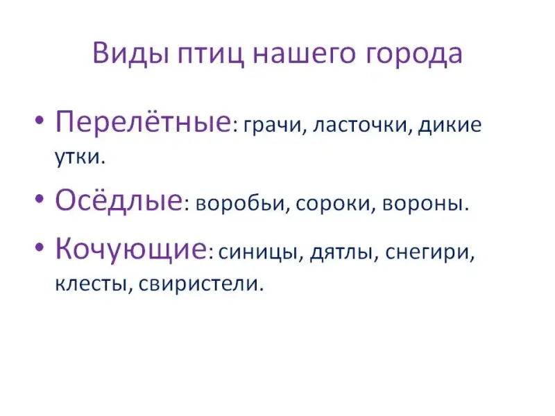 В нашем городе встречаются перелётные, осёдлые и кочующие птицы.