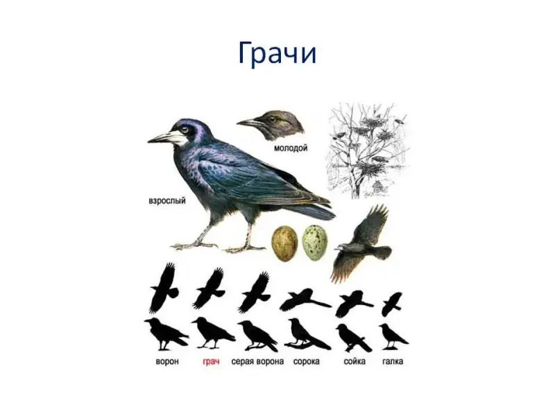 Грач - большая черная птица. Размеры тела до 46 см, размах крыльев до 90 см. Вес 600 граммов. Грачи - стайные птицы. Они селятся большими колониями и строят гнезда близко друг к другу. В старом парке у пруда, грачиные гнезда. Каждый год грачи возвращаются на это место. Их гнезда сложены из сучьев. На 6 деревьях можно увидеть по 1 гнезду. На 3 деревьях - по 3 гнезда. Грачи прилетают в марте. Об этом даже в газетах пишут. Прилет грачей - верный признак начала весны. Это одна из самых полезных птиц. Своим длинным крепким клювом грачи выкапывают из земли личинок насекомых и червей. Грач - прожорливая птица. Только за один раз птенцам приносит до 70 гусениц. Осенью видно, как поднимается туча черных точек - это грачи обучают своих птенцов полету.