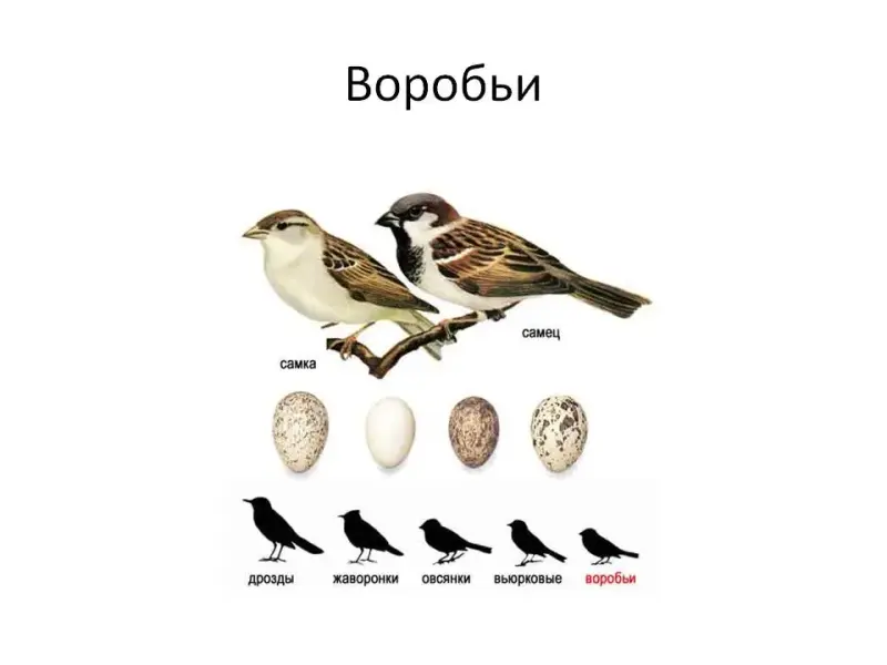 Воробей - маленькая птичка. Летают воробьи маленькими стайками. По короткому клюву можно сказать, что питаются они зерном. Гнезда строят в дуплах, в трещинах стен, в скворечниках. Гнездо делается из соломы и листьев и выстилается перьями. Воробьи иногда ухитряются вывести птенцов трижды за лето. Малышей растят родители вместе. За первую неделю воробьенок тяжелеет в 6 раз. Размер - 14, вес - 25 граммов, питание - корни и семена.