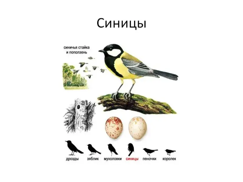 Серо - голубая птица с желтой грудкой. Всю зиму перелетают с места на место в поисках корма. Гнезда устраивает в дуплах, в щелях построек, в почтовых ящиках. Гнездо строит из веточек, пуха, шерсти. Питается пауками, мелкими насекомыми, личинками, гусеницами. За день синица съедает столько, сколько весит сама. Птенцов кормит по 200 раз в день. Через 2 недели птенцы вылетают на волю. А в гнезде появляется новая кладка яиц. Зимой достать корм трудно. Надо вывешивать кормушки. Подкармливать птиц сменами, пшеном, корками сыра, крошками белого хлеба.