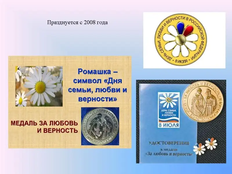 (10 слайд) У нового семейного праздника есть медаль, которую будут вручать 8 июля, и очень нежный символ - ромашка.