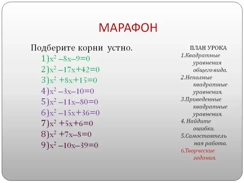 На слайде «марафон» надо решить приведенные квадратные уравнения устно. Этот этап нужно провести эмоционально в духе соревнования. Считаю, что умение решать данные уравнения быстро и устно экономит время в старших классах при решении других заданий, где встречаются такие вычисления. Отработка базовых вычислительных навыков решения квадратных уравнений с применением теоремы, обратной теореме Виета в системе дает преимущество на любых конкурсных экзаменах по затраченному времени. Этот этап урока рассчитан на сильных учеников, провести его надо в духе соревнования: кто быстрее и больше решит уравнений, т.е. надо понимать, что это возможность ситуации успеха для учащихся группы «А» или условно «сильных».