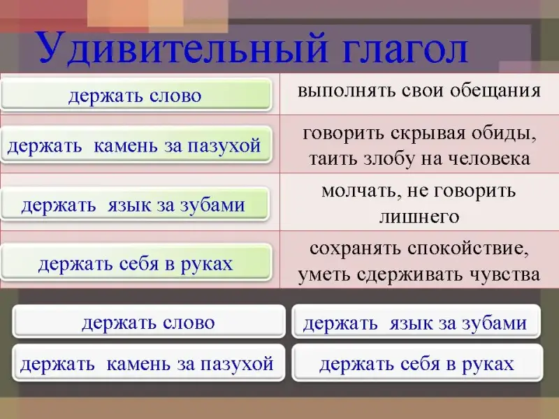 Учитель: С глаголом «держать» связано очень много устойчивых выражений. Мне бы хотелось знать, как вы понимаете некоторые из них:
