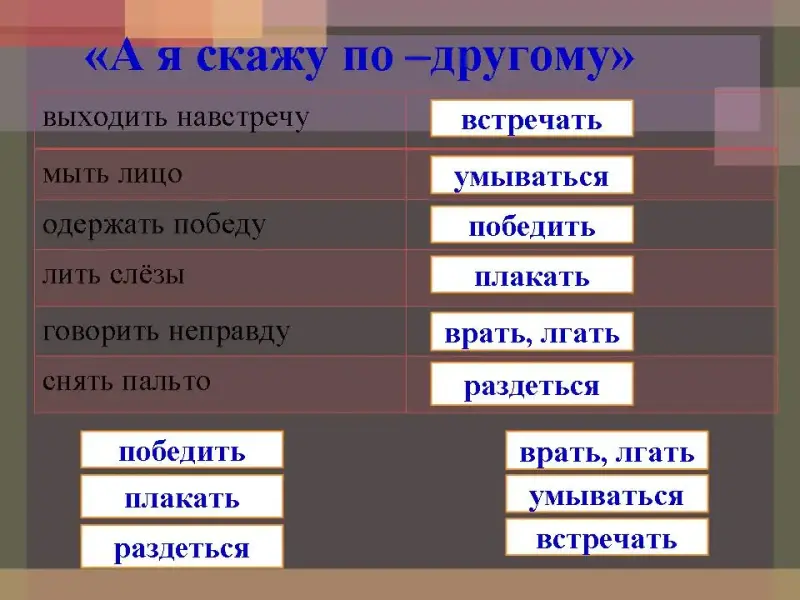 - распределение фразеологических оборотов в соответствии с их значениями (глаголами неопределённой формы);