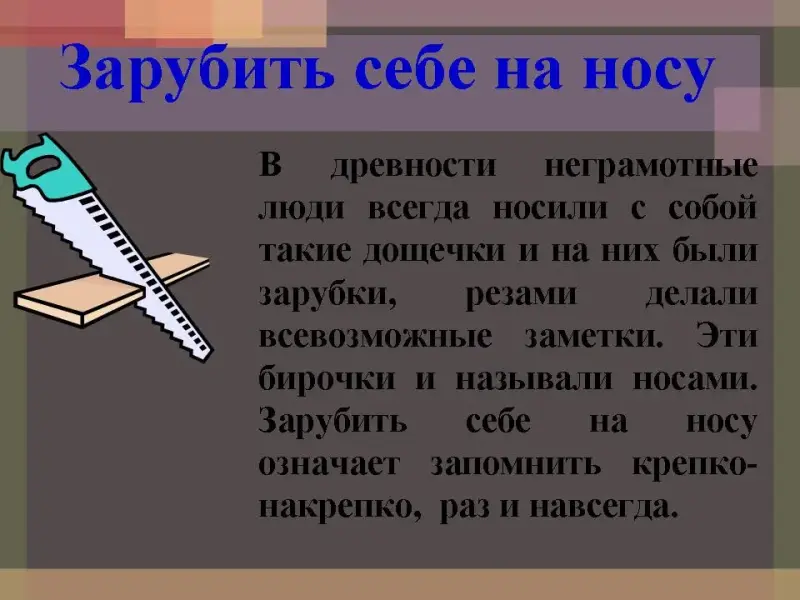 Значение фразеологизма: в древности неграмотные люди всегда носили с собой такие дощечки и на них были зарубки, резами делали всевозможные заметки. Эти бирочки и называли носами. Зарубить себе на носу означает запомнить крепко-накрепко, раз и навсегда.