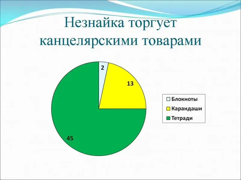 Рассмотрим задачу на построение круговой диаграммы. Пример 1. Незнайка торгует канцелярскими товарами: блокнотами, карандашами, тетрадями. Будем считать, что за день он продал 2 блокнота, 13 карандашей и 45 тетрадей. Построить круговую диаграмму, показывающую, какой товар покупался в течение дня чаще всего. Круговая диаграмма, как и следует из названия, располагается на круге. Круг - это 360 градусов. Суммарное количество проданных товаров составляет 60 штук. Значит, за 1 штуку товара приходится 360:60=6 градусов. Пересчитаем «товар в градусы»: 2-м блокнотам будет соответствовать 2∙6=12 градусов; 13-ти карандашам - 13∙6=78 градусов; 45-ти тетрадям - 45∙6=270 градусов. Осталось разбить круг на три сектора - 12, 78 и 270 градусов |