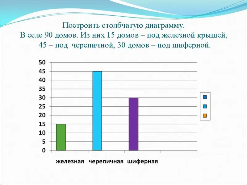 Во-первых, на одном круге может оказаться слишком много секторов. Во-вторых, все сектора могут быть примерно одинакового размера. Вместе эти две причины делают круговую диаграмму малополезной. Значит, нужен другой инструмент, диаграмма другого типа. Это - столбчатые диаграммы, где числовые данные изображаются в виде столбиков, высота которых пропорциональна этим числам. Столбчатые диаграммы, как и большинство диаграмм с которыми мы еще познакомимся, строятся в прямоугольной системе координат. Применяются для сравнения данных в пределах одного временного периода. Рассмотрим пример. Пример 2. В селе 90 домов. Из них 15 домов - под железной крышей, 45 домов под черепичной крышей и 30 домов - под шиферной. Для этого надо нарисовать три столбика, высота которых соответствует количеству домов каждого вида. Пусть высота первого столбика 15 мм, второго 45 мм, третьего 3 0мм. Ребята, оцените затраты времени на построение диаграммы вручную? Оказывается, существуют компьютерные программы, позволяющие строить различные диаграммы, в том числе столбчатые, автоматически. Наиболее распространенная из них Microsoft Excel. Вспомним алгоритм построения диаграмм в компьютерном варианте: 1. Построить таблицу с исходными данными. 2. Выделить блок клеток. 3. Вызвать Мастер диаграмм. (Меню - Вставка - Диаграмма). 4. Выбрать тип диаграммы - гистограмма и вид. 5. Вставить заголовки и подписи данных. 6. Поместить диаграмму на имеющемся листе. |