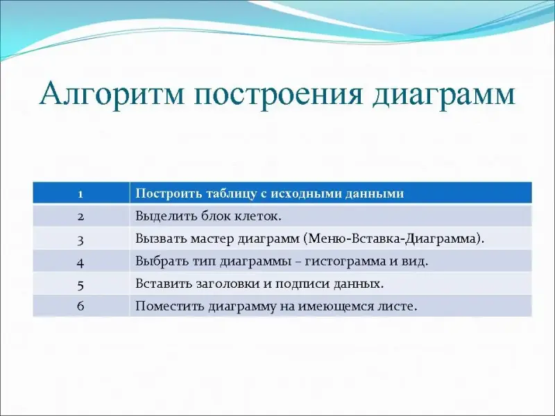 Учащиеся получают алгоритм построения диаграмм на отдельных листочках и карточку 1 с текстом задачи. (См. приложение) | Самостоятельно выполняют задание за компьютерами