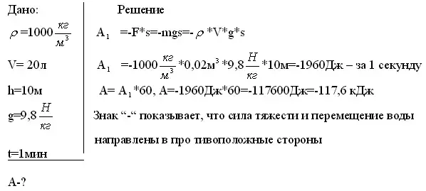 Задача № 3. Насос каждую секунду подает 20л воды на высоту 10м. Какую механическую работу производит насос за 1 минуту?