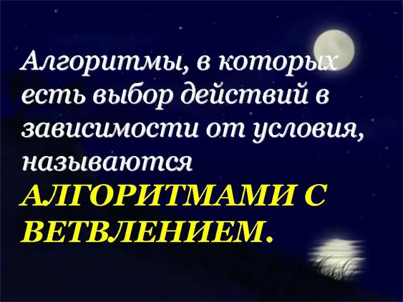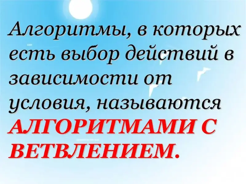 Каждый день нам приходится принимать решения в зависимости от сложившейся ситуации или определённых условий. Если на улице холодно, то мы одеваемся теплее. Если мы хотим есть, то мы едим… Таких ситуаций огромное множество. Так и в алгоритме бывают такие действия, которые выполняются не всегда, а только при соблюдении определённого условия. Каждый раз при выполнении алгоритма условие необходимо проверять. Итак. Сегодня мы с вами познакомимся с новыми видами алгоритмов. И первый из них - алгоритм с ветвлением. Внимание на экран.
