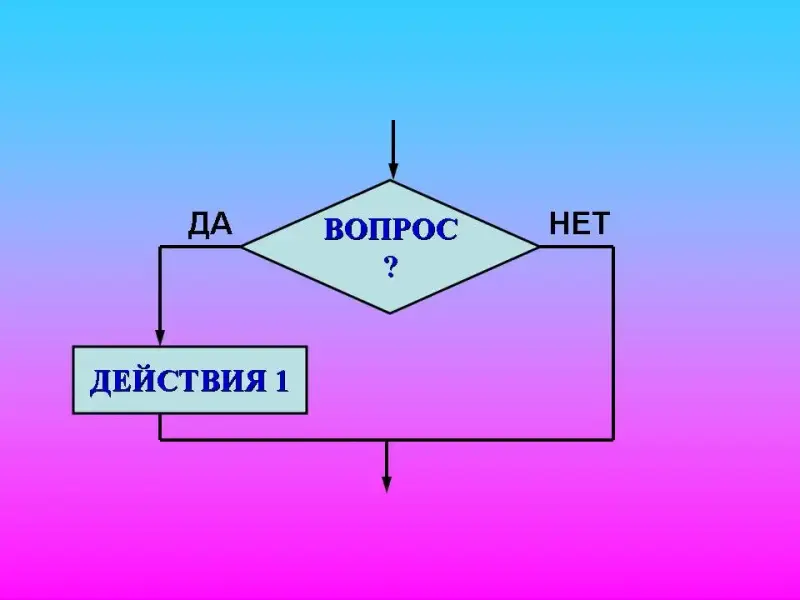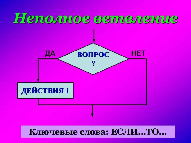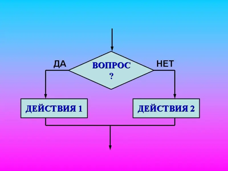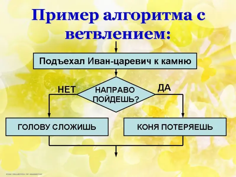 Подъехал Иван-царевич к камню, а на камне надпись: «направо пойдёшь..», и дальше он должен сделать свой выбор. Если он решит пойти направо, то потеряет коня, а если нет, то сложит голову. Итак, есть выбор, есть два направления. В зависимости от ответа на вопрос: ДА или НЕТ, - движение продолжается либо по одной, либо по другой ветке. Смотрите на схему. Что же произойдёт дальше? А дальше эти ветки вновь объединятся и алгоритм движения продолжится.