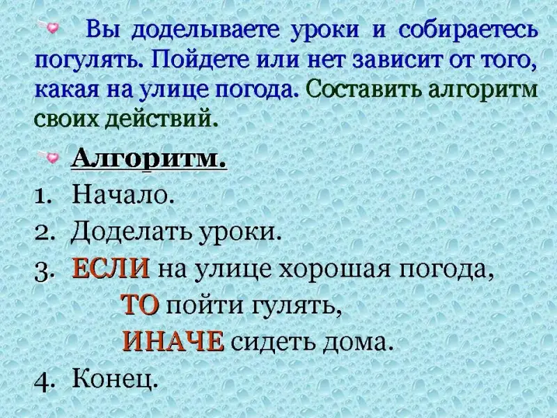 {Демонстрируется СЛАЙД 9} Вы доделываете уроки и собираетесь погулять. Пойдете или нет зависит от того, какая на улице погода. Составить алгоритм своих действий (алгоритм зачитывается со СЛАЙДА).