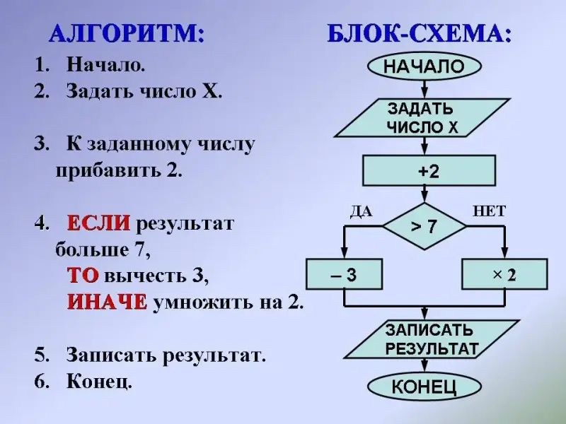Комментарии к слайду 12. Смотрим. Опять слева у нас изображен наш алгоритм, а справа будем составлять блок-схему (после каждого правильного ответа на экране появляется очередной элемент блок-схемы). Первому пункту соответствует блок начала… Второй пункт «Задать число Х». Как будет выглядеть этот блок?.. (Вспоминайте, слова ЗАДАТЬ, ВВЕСТИ и т.д. какому блоку соответствуют?) Следующий пункт «К заданному числу прибавить 2». Это действие, команда, а значит этот блок выглядит как… прямоугольник… Далее, следующим пунктом у нас появляется условие «ЕСЛИ результат больше 7». При ответе ДА мы вычтем из результата 3, а при ответе НЕТ - умножим результат на 2. И в том и в другом случае мы получим какое-то число. Следующий пункт «Записать результат». Значит, у нас появится блок вывода результата. Какая геометрическая фигура ему соответствует?.. Ну и последний блок - блок конца алгоритма…