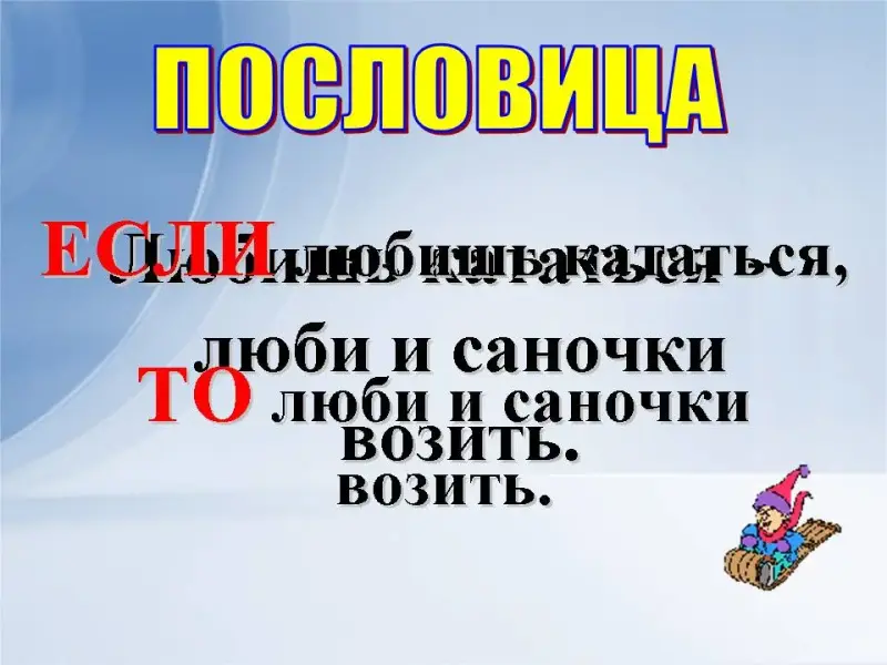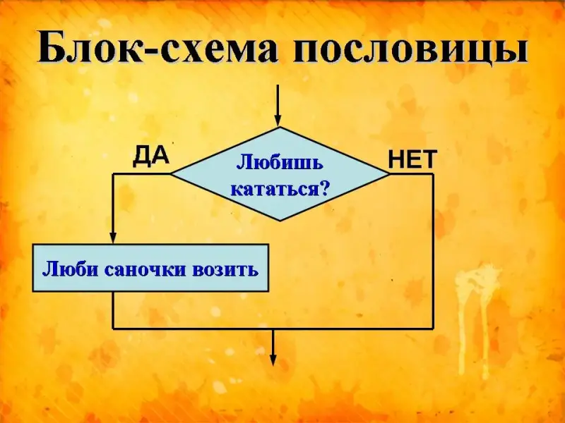 Комментарии к слайду 13. Давайте вспомним пословицу: любишь кататься - люби и саночки возить. Переделаем её на алгоритмический язык: ЕСЛИ любишь кататься, ТО люби и саночки возить. Если мы сейчас начнём составлять блок-схему, то веточка НЕТ исчезнет, так как у нас всего одно действие, а действие с ключевым словом ИНАЧЕ отсутствует. Смотрите на экран…