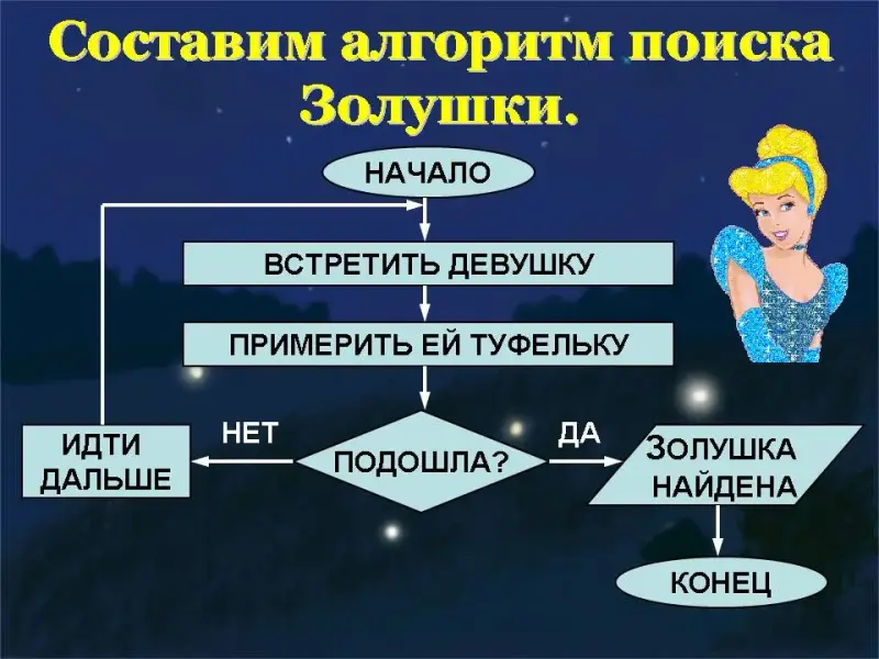 А теперь давайте-ка вспомним сказки и попробуем составить алгоритм поиска Золушки. Вспоминайте… Золушка, убегая с бала, потеряла туфельку, и принц стал ее искать. Как же он это делал?…