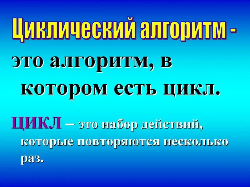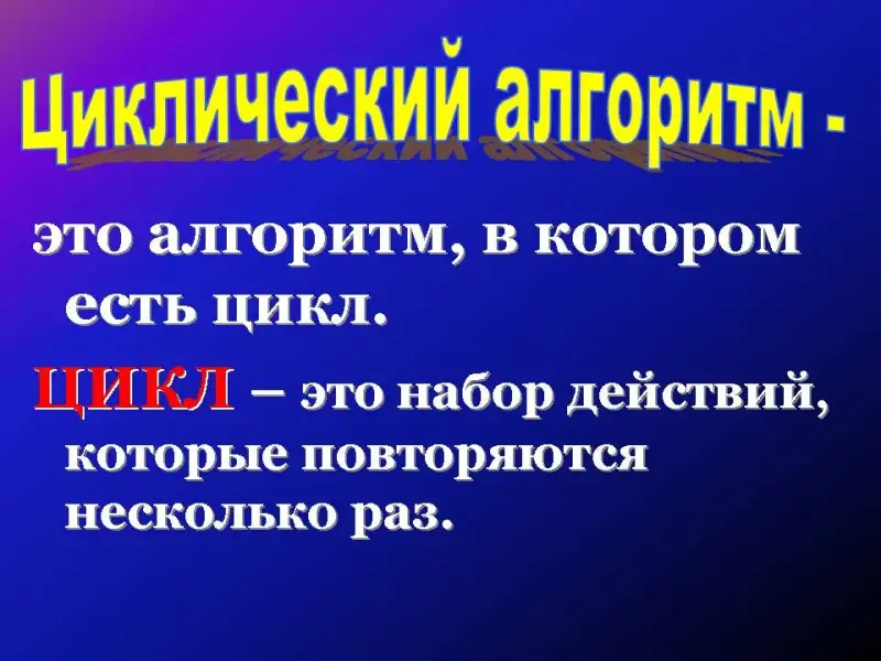 Итак… {Демонстрируется СЛАЙД 18} Циклический алгоритм - это алгоритм, в котором есть цикл. ЦИКЛ - это набор действий, которые повторяются несколько раз (многократно).