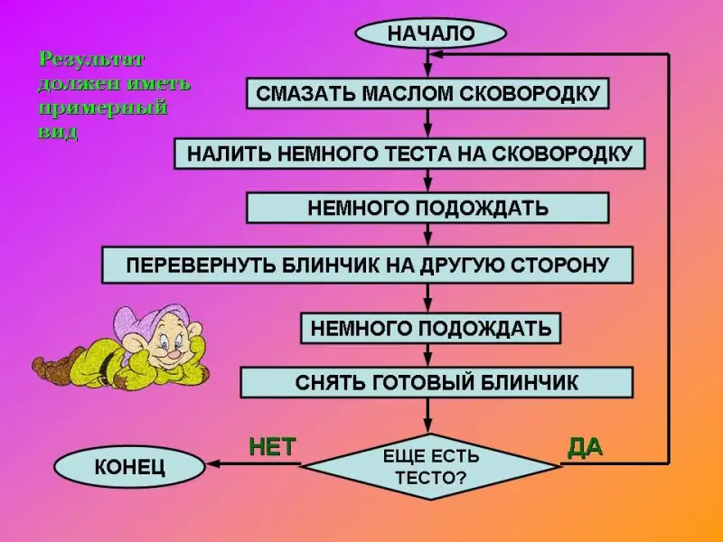Однажды Белоснежка задумала приготовить своим друзьям гномам сюрприз - угостить их вкусными блинами. Она сделала тесто, но не может вспомнить, как же их готовить. Помогите Белоснежке. Составьте алгоритм приготовления блинов.