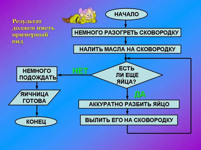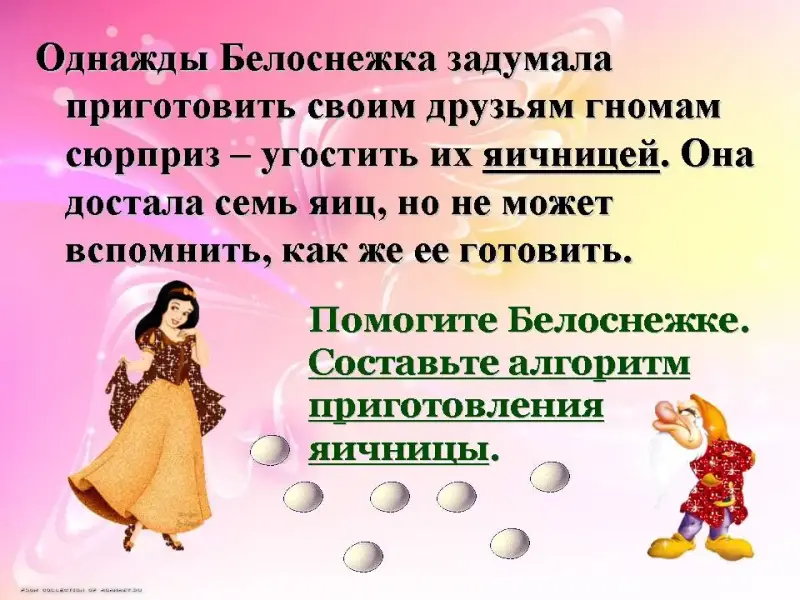 Однажды Белоснежка задумала приготовить своим друзьям гномам сюрприз - угостить их яичницей. Она достала семь яиц, но не может вспомнить, как же ее готовить. Помогите Белоснежке. Составьте алгоритм приготовления яичницы.