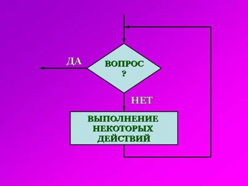 Комментарии к слайду 17. (При составлении блок-схемы ученики предлагают свои варианты, а учитель выбирает нужное. После каждого правильного ответа на экране появляется очередной элемент блок-схемы…) Вы видите, что по веточке ДА алгоритм уходит в одну сторону, а по веточке НЕТ он многократно возвращается к предыдущим действиям. Так получается цикл.