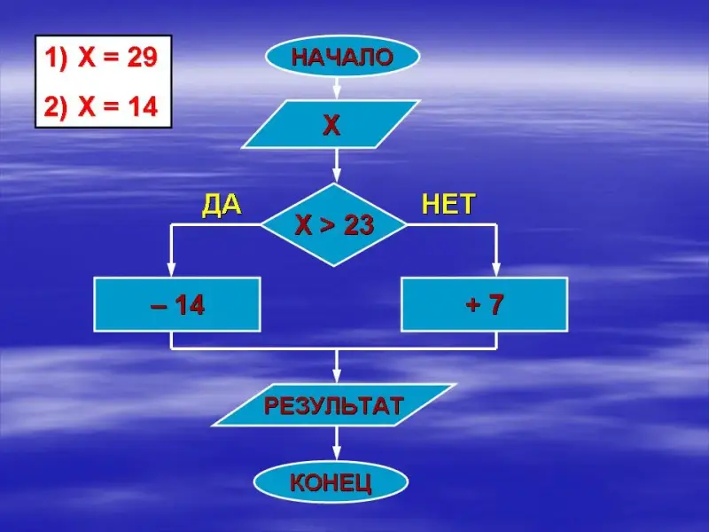 Давайте разбираться со вторым случаем. Х=14. Смотрим; Х мы задали, и теперь вместо Х у нас число 14… Следующий блок - блок ПРОВЕРКИ УСЛОВИЯ. Вместо Х у нас число 14, т.е. условие будет звучать, как 14>23?.. Вопрос ко всем… НЕТ, а значит, мы продолжим наше движение вот по этой веточке и прибавим к нашему числу 14 число 7. Что же у нас получится: 14+7?.. 21…