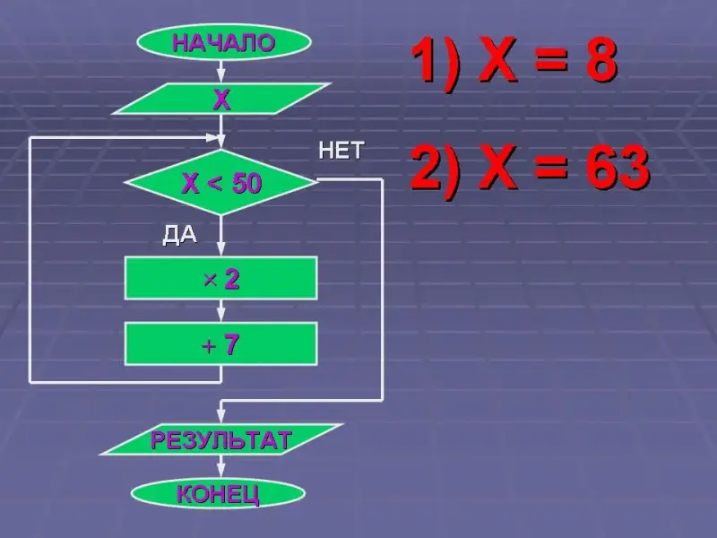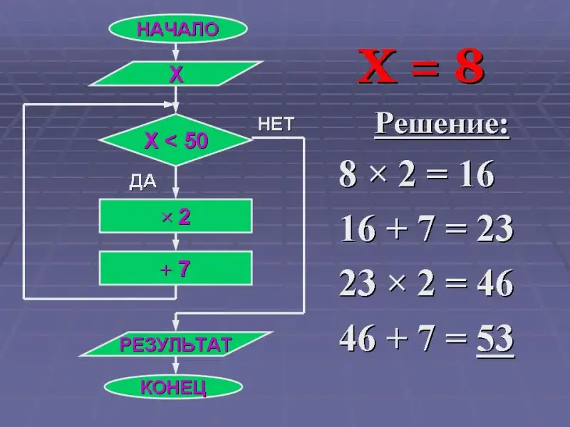 Х=8. Смотрим; Х мы задали, и теперь вместо Х у нас число 8… Следующий блок - блок ПРОВЕРКИ УСЛОВИЯ. Вместо Х у нас число 8, т.е. условие будет звучать, как 8<50?.. Вопрос ко всем… ДА, а значит, мы продолжим наше движение вот по этой веточке и умножим наше число 8 на 2. Что же у нас получится: 8×2?.. 16… А теперь к числу 16 прибавляем число 7. Сколько будет?.. 16+7?.. 23… Продолжаем двигаться по стрелочке и опять приходим к нашему условию. Только теперь у нас вместо Х будет тот результат, который мы только что получили. Это число 23… И давайте рассуждать дальше…