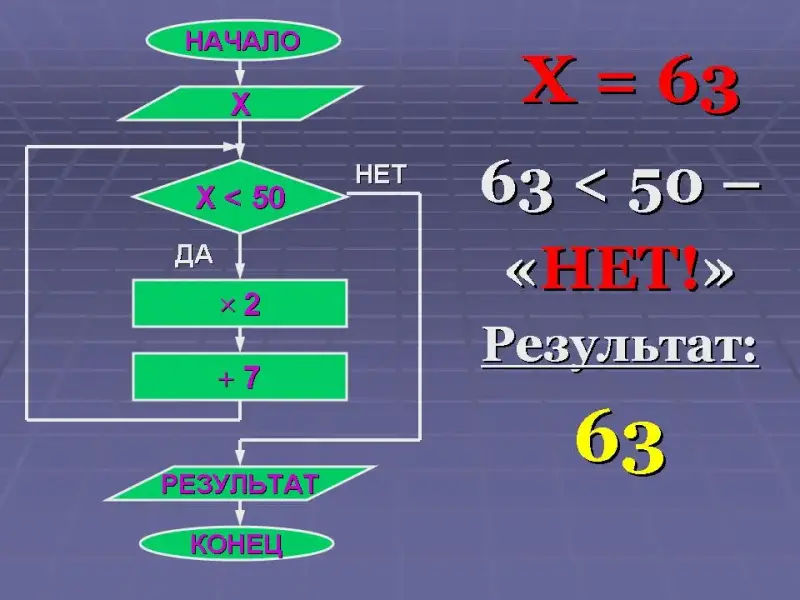 Х=63. Смотрим; Х мы задали, и теперь вместо Х у нас число 63… Следующий блок - блок ПРОВЕРКИ УСЛОВИЯ. Вместо Х у нас число 63, т.е. условие будет звучать, как 63<50?.. Вопрос ко всем… НЕТ! А значит, мы сразу продолжим наше движение вот по этой веточке (по веточке НЕТ) и попадаем на вывод результата. А значит наш результат «63».