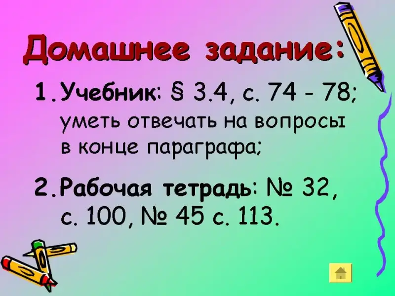 Внимание, задание на дом…{Демонстрируется СЛАЙД 34} Домашнее задание дается на усмотрение учителя.