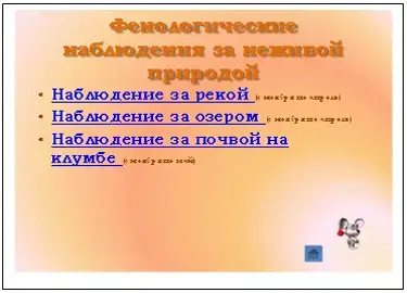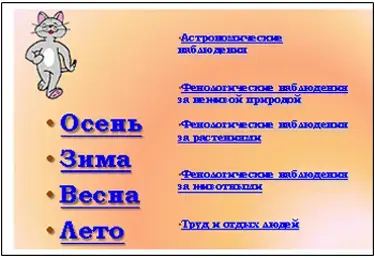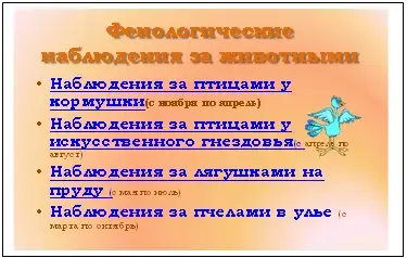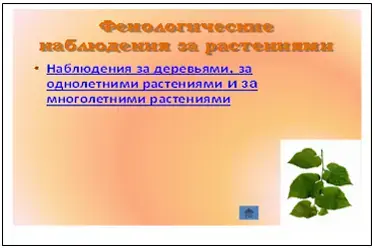Далее можно приступить к работе с разделами, которые посвящены фенологическим наблюдениям, начиная с фенологического календаря [см. Приложение 5]. Календарь указывает на точные или примерные даты тех или иных предстоящих событий, которые отслеживаются учителем и детьми. Ссылка на фенологический календарь находится на втором слайде презентации. Фотографии и видеофрагменты с изображением природных объектов, упомянутых в фенологическом календаре, можно просмотреть, щелкнув по названию этих объектов.
