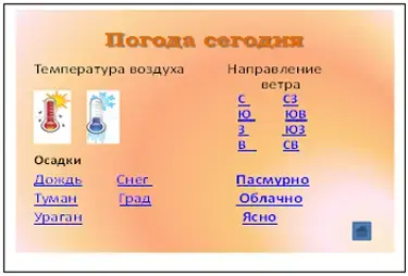 Данный раздел позволяет во 2-4 классах отмечать температуру воздуха, щелкнув по одному из двух градусников. Синий градусник выбирают в случае, если показания температуры ниже нуля; красный градусник, соответственно, если температура выше нуля. В первом классе на этом этапе можно просто обсудить холодно или тепло в данный день на улице. После этого первоклассники должны назвать, какой градусник: красный или синий, соответствует сегодняшней погоде. Далее в этом же разделе обсуждается направление ветра и просматривается нужное направление на розе ветров, щелкнув по сокращенному названию (Ю, С, В, З, СВ, СЗ, ЮВ, ЮЗ) [см. Приложение 1]. Затем обсуждается наличие осадков в этот день и просматривается нужное изображение (дождь, снег, туман, ураган, град).