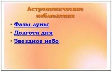 Раздел «Астрономические наблюдения» состоит из трех подразделов: «Фазы луны», «Долгота дня» и «Звездное небо».
