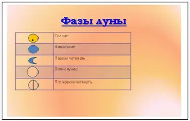 открывается таблица обозначения лунных фаз условными знаками. Каждую фазу можно просмотреть с помощью изображения, щелкнув левой кнопкой мыши по обозначению лунной фазы.