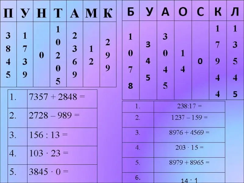 | Ввести понятие экологии, ознакомить со свойствами воды, повторить все действия с натуральными числами, решение уравнений. | Развивать навыки самостоятельной работы, самоконтроля, взаимоконтроля, способствовать развитию познавательного интереса к математике через различные формы работы. | Воспитывать умение работать в паре, самостоятельность, настойчивость для достижения конечных результатов, умение видеть связь между математикой и окружающей жизнью. |