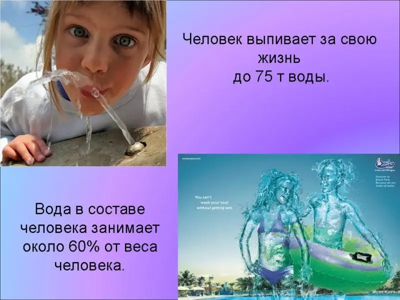 Вода играет огромную роль в жизни человека. Мы с вами не задумываемся, сколько воды мы выпиваем за всю жизнь. Оказалось очень внушительную цифру, и как доказали учёные мы с вами состоим более 60% из воды. Если без пищи человек может прожить достаточно долга, то без воды на 5 сутки наступает смерть.