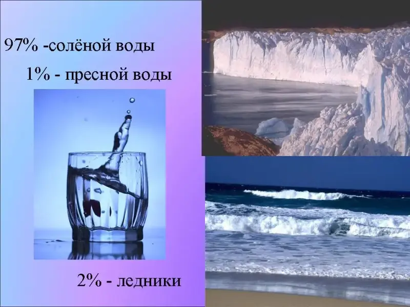 На нашей земле кажется столько воды - рек, озёр, морей и океанов. Из всех этих запасов 97% солёная вода, непригодная в пищу; 2% вода в твёрдом состоянии - ледники. И только 1% пресной воды.