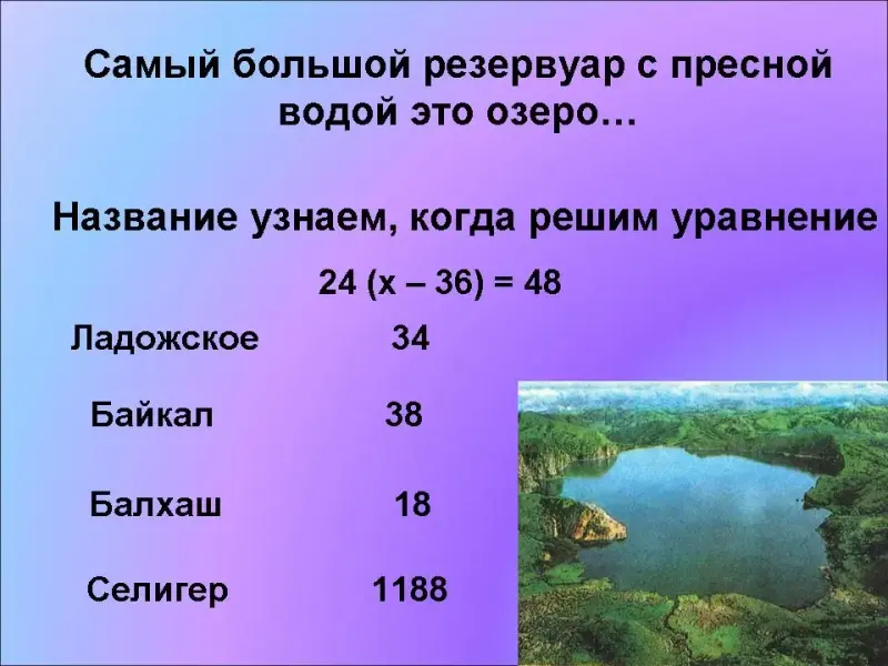 Самые большие запасы пресной воды сконцентрированы в озере. Название определим решив уравнение
