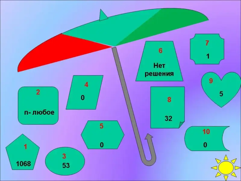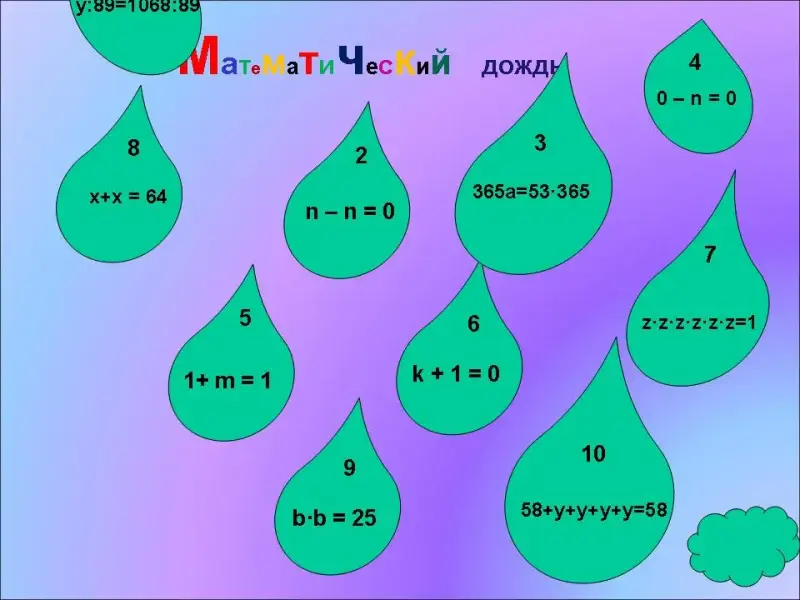 (Слайд 20 математический дождь). Пары обмениваются тетрадями, и идёт взаимопроверка. Открываю (Слайд 23 ответы).