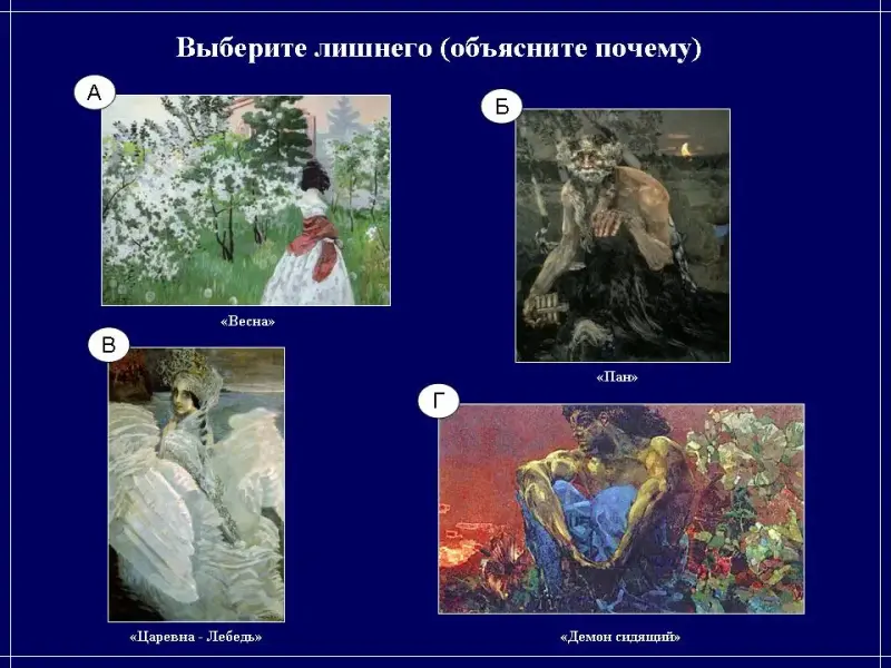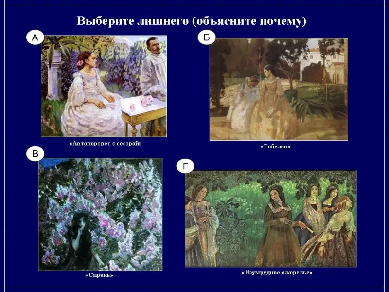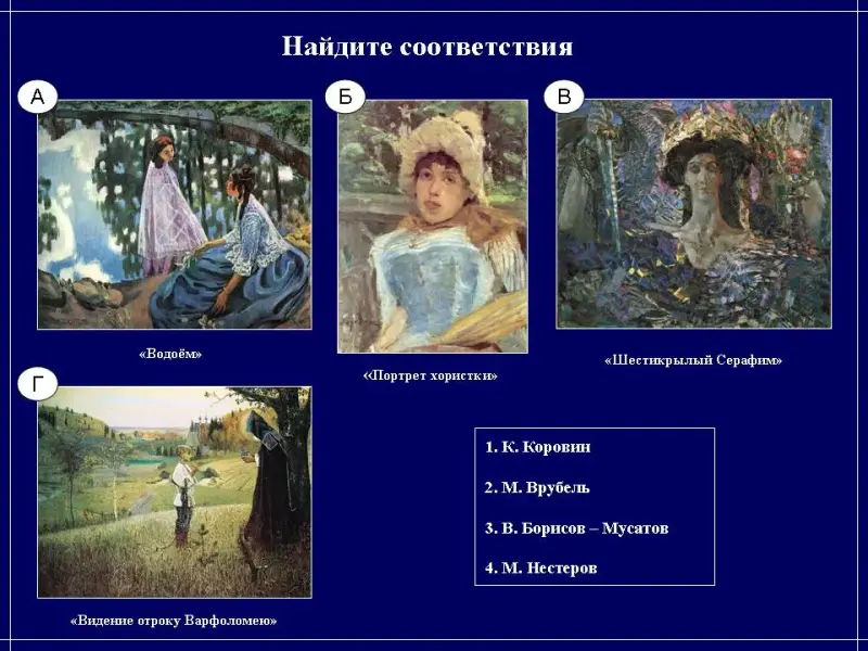 Преподаватель. На прошлом занятии мы с вами начали знакомство с творчеством художников Серебряного века. Для повторения пройденного материала и его переосмысления вам предлагается выполнить тестовые задания (Презентация 1). Свои ответы запишите в тетрадь.
