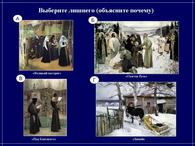 Преподаватель. Давайте посмотрим на репродукции данных картин и определимся с видом этих живописных изображений: что это - настенная живопись или станковые картины.