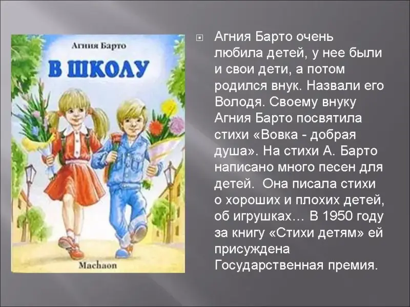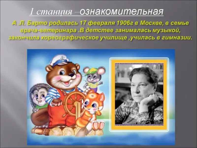 Она родилась в Москве (1906-1981) в семье врача-ветеринара. Писать стихи начала ещё в школьные годы. В 1925 году вышла её первая детская книга. С тех пор она стала писать стихи и поэмы для детей разных возрастов. Агния Барто очень любила детей, у нее были и свои дети, а потом родился внук. Назвали его Володя. Своему внуку Агния Барто посвятила стихи "Вовка - добрая душа". На стихи А. Барто написано много песен для детей. Она писала стихи о хороших и плохих детей, об игрушках… В 1950 году за книгу "Стихи детям" ей присуждена Государственная премия.