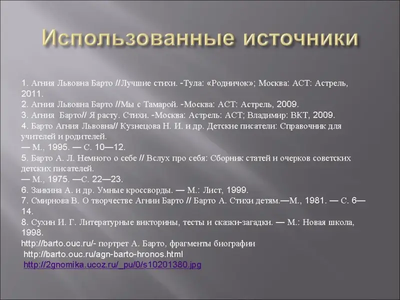 5. Барто А.Л. Немного о себе // Вслух про себя: Сборник статей и очерков советских детских писателей. - М., 1975. - С. 22-23.